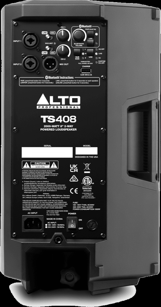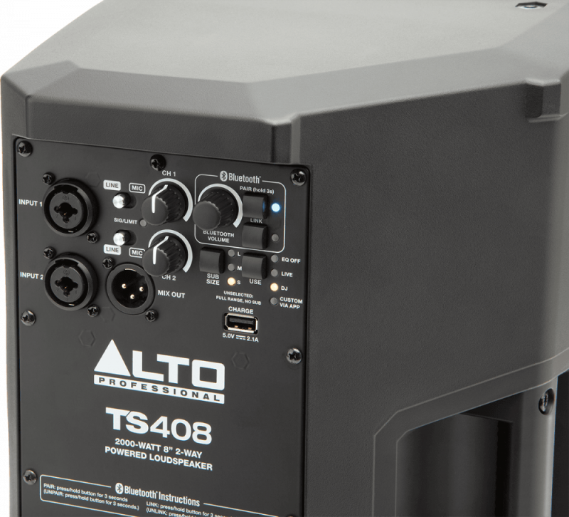 Coté paramétrages, la TS408 dispose de nombreux contrôles et filtres de haute qualité. L'enceinte est pourvue de 2 entrées combo JACK/XLR avec un selecteur MIC/LINE et un pour s'adapter a tout les branchement. Le canal Bluetooth permet aussi un réglage de volume indépendant. Un bouton PAIR autorise l’appairage d’un appareil Bluetooth compatible à l’enceinte, tandis que le Stereo Link vous permettra d’appairer une autre enceinte TS4 à proximité sans avoir besoin de câbles. Enfin les enceintes ont un filtre intégré DSP permettant d’optimiser le rendu acoustique de l’enceinte, afin d’obtenir un son d’exception sur vos évènements live ou durant vos sets DJ en un clin d’œil