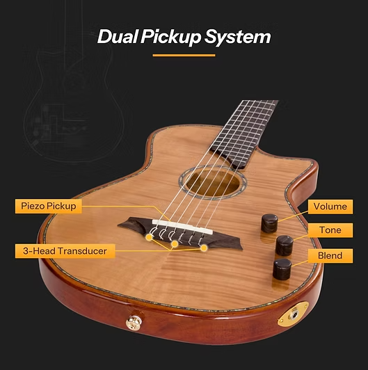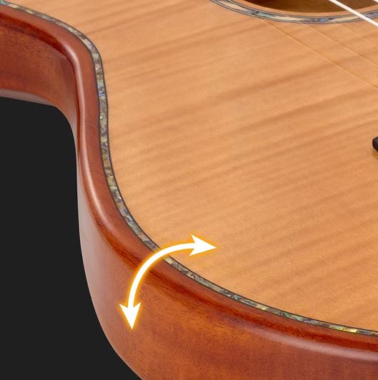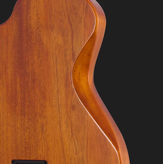 Sa table massive en épicéa Sitka, plaquée d’un somptueux okoumé flammé 5A, délivre un son clair, riche et articulé, tandis que le corps en acajou massif entièrement chambré assure résonance et légèreté tout en limitant le larsen sur scène. Le système de barrage sculpté innovant combiné au ToneFlow design garantit un équilibre parfait entre projection acoustique et contrôle amplifié.