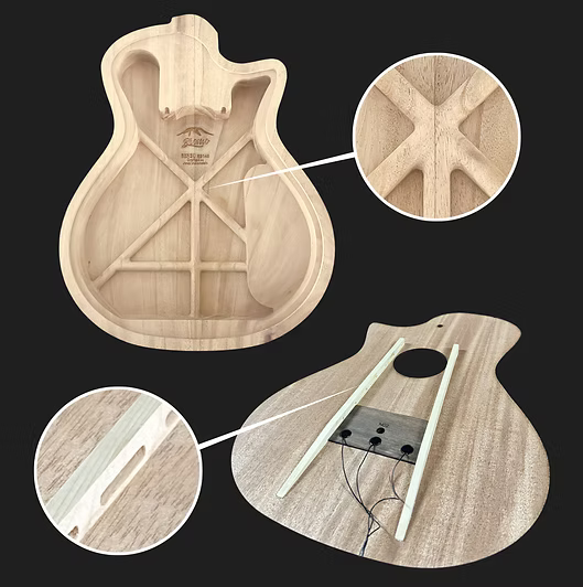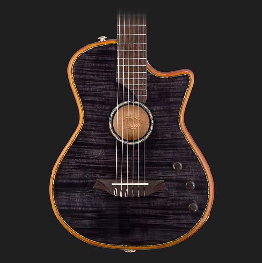 Sa table massive en épicéa Sitka, sublimée par un placage en okoumé flammé 5A, produit un son clair, équilibré et articulé. Le corps en acajou massif chambré garantit une excellente résonance, une légèreté accrue et une réduction efficace du larsen en situation amplifiée. Le barrage breveté ToneFlow optimise la projection acoustique tout en assurant un contrôle parfait une fois branchée.