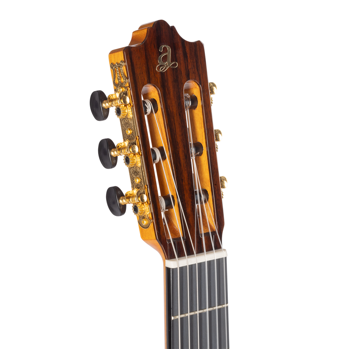 Ses composants haut de gamme — touche en ébène, chevalet en palissandre, mécaniques dorées, sillets en os et cordes Savarez 500 CJ — assurent une stabilité remarquable et un timbre riche.