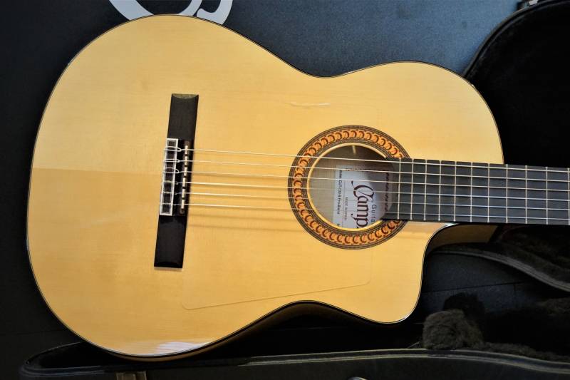 La Camps CUT500S est une guitare flamenco électro-acoustique à pan coupé qui possède une table massive en épicéa. Le dos et les éclisses sont en érable Sycomore tandis que le manche en cèdre accueille une touche en ébène. Un truss rod intégré au manche permet de régler les tensions, et ce modèle est équipé du système électronique Fishman Prefix Problend.